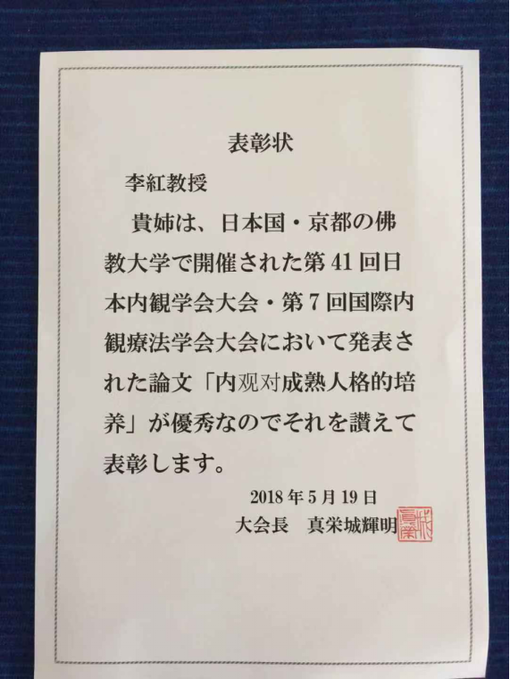 2018.05.18第七届国际内观疗法学会暨第41届日本内观学会大会(李红一等奖证书)