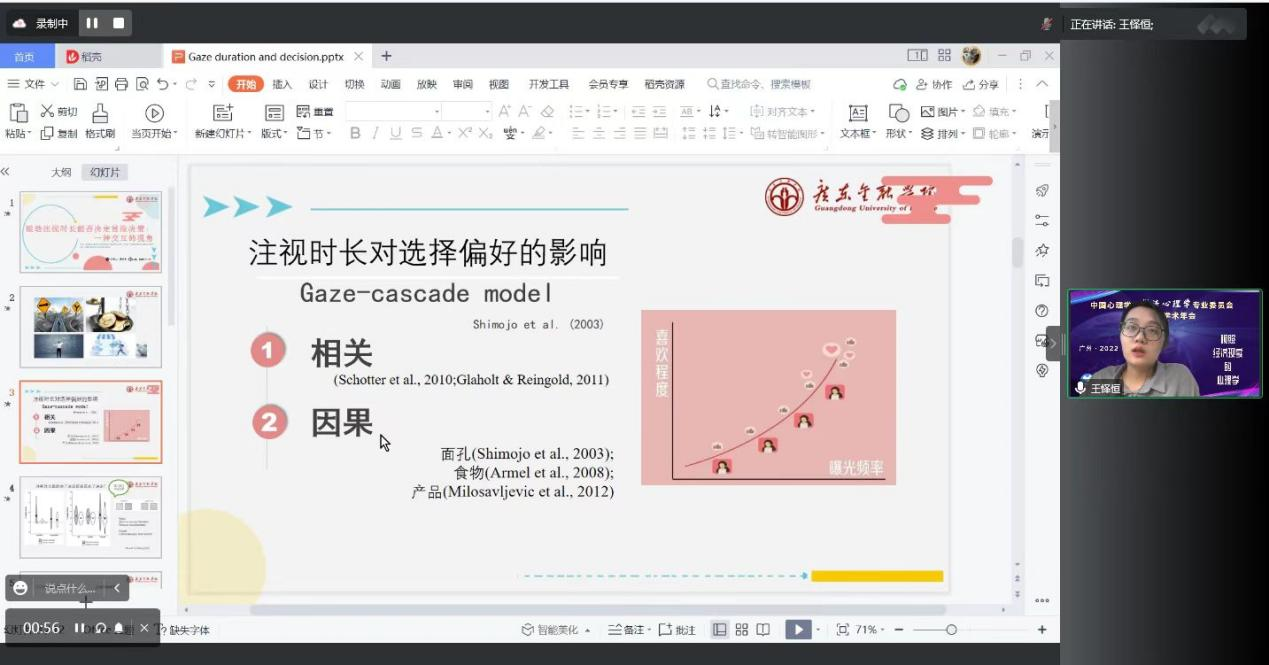 论坛首先由王怿恒博士报告了在SCI期刊《Journal of Eye Movement Research》发表的文章。她的研究发现,注视时长和主观偏高能够共同影响冒险投资决策。另外注视时长的影响受任务难度影响,当任务需要更多的计算时,眼动注视的操纵时长也需要相应增加。