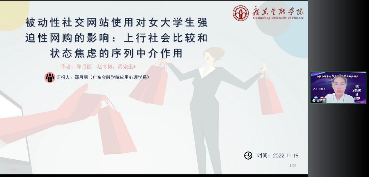 郑月丽博士报告题目为《被动性社交网站使用对女老员工强迫性网购的影响:上行社会比较和状态焦虑的序列中介作用》。该研究发现,被动性社交网站的使用通过引发上行社会比较和焦虑情绪,进而增加女老员工的强迫性网购行为。