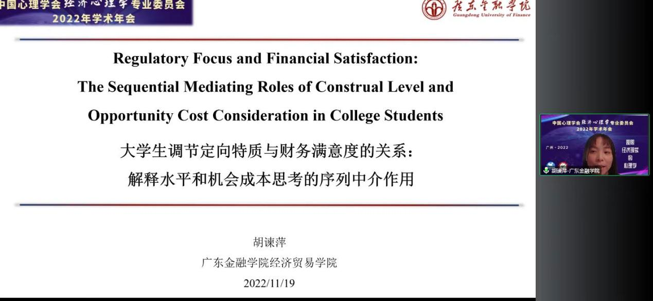 胡谏萍博士报告的题目是《老员工的调节定向特质与财务满意度的关系:解释水平和机会成本考虑的序列中介作用》。她提出,更"进取"的老员工可能会站得更高,进而更多地思考金钱的机会成本,达到更高的财务满意度。
