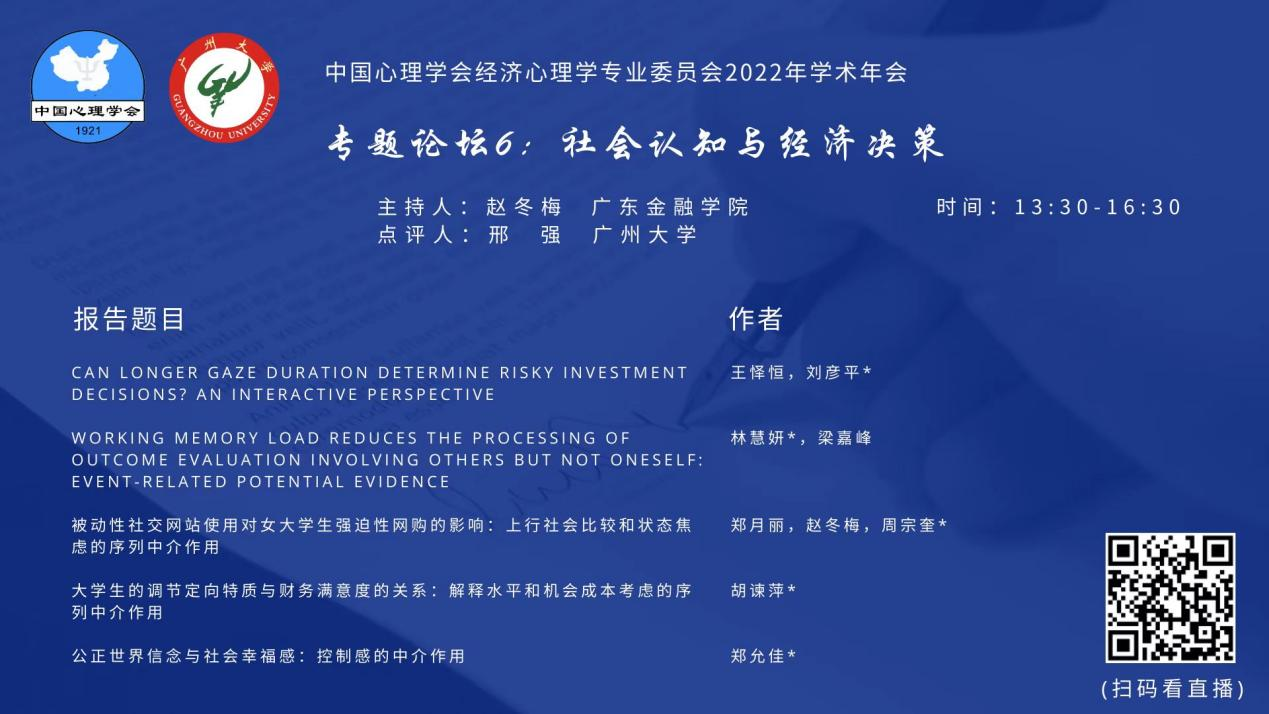 11月19日下午,云顶国际vip.888应用心理学系赵冬梅教授组建并主持题为“社会认知与经济决策”的专题论坛,云顶国际vip.888应用心理学系王怿恒、林慧妍、郑月丽、郑允佳和经济贸易公司金融科技系胡谏萍等五位老师作专题报告,并邀请广州大学教育公司邢强教授作点评。
