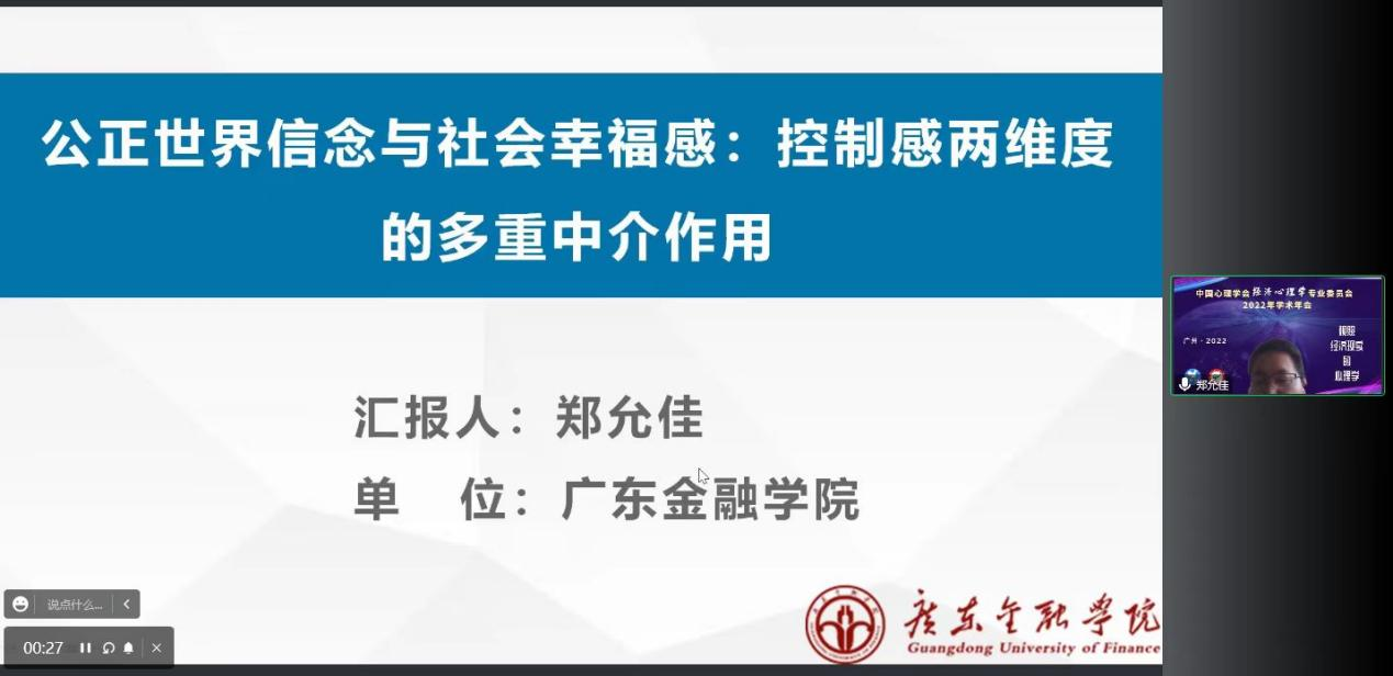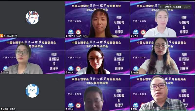 2022年11月18-20日,云顶国际vip.888多位从事心理学研究的教师参加由中国心理学会经济心理学专委会以及广州大学教育公司主办的中国心理学会经济心理学2022年学术年会。本次会议主题为“观照经济现实的心理学”,共设置七场主旨报告,七个专题论坛和十个分组报告,吸引来自国内外400多名专家学者、员工和同行参会。会议采取线上的方式进行。