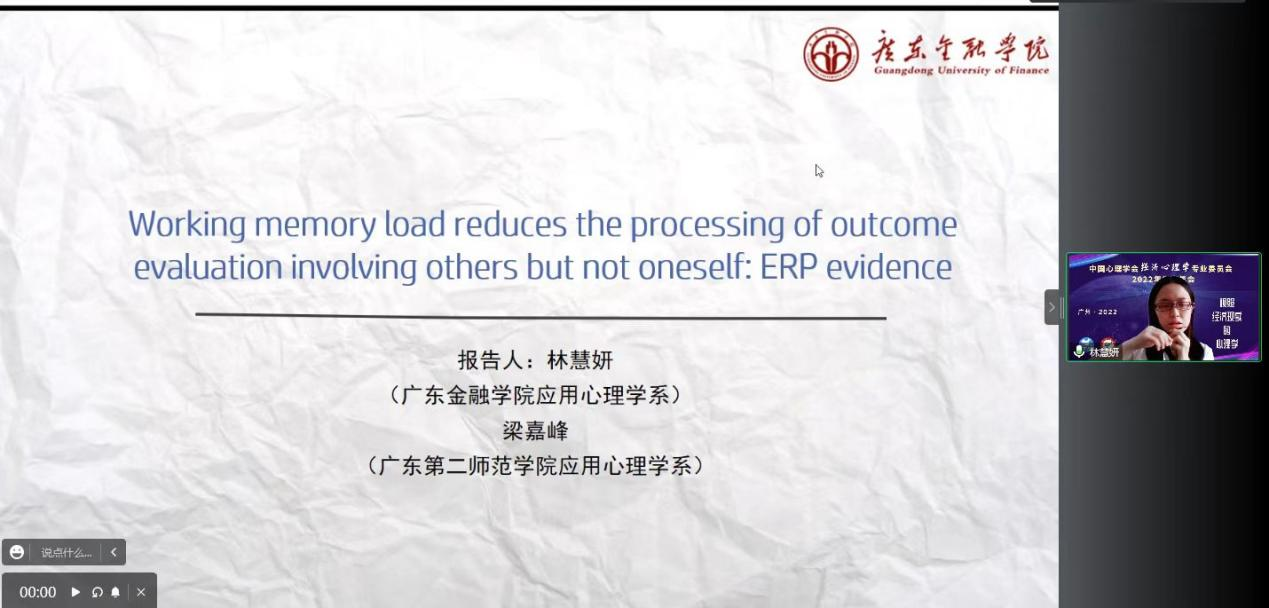 接下来,林慧妍教授报告近期在SSCI期刊《Psychophysiology》的论文。她强调,人类的大脑只有在资源充足的情况下,才会同时关注自我和他人的信息;在资源不足时,就只会关注自己而不再关注他人。