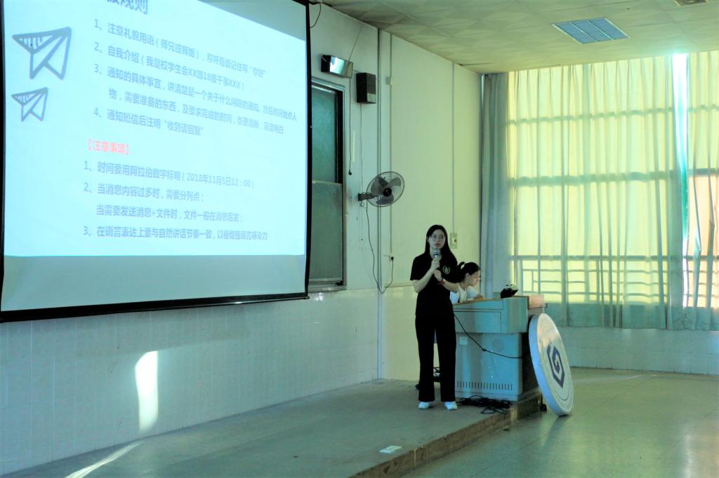 首先,点满写作技能的校员工会办公室干事刘岚清同学为大家介绍了培训的内容包括公文写作与撰写公文策划书。她向大家讲解了公文的含义,并介绍了本次培训内容的三个方面: