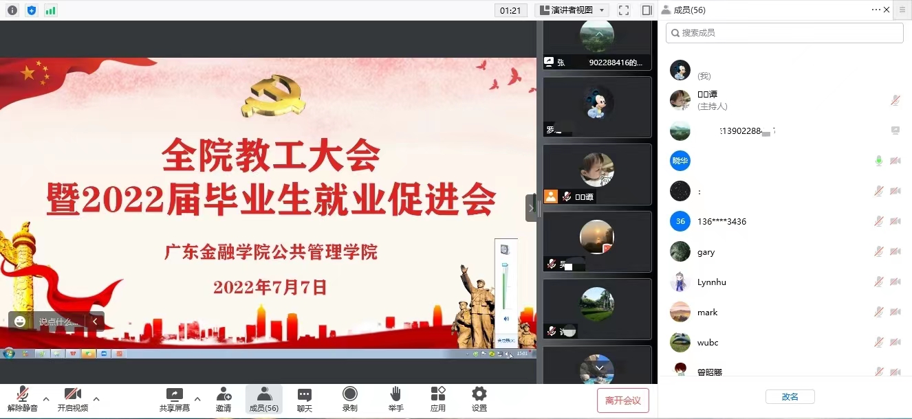 2022年7月7日下午,云顶国际vip.888在腾讯会议召开了全院教工大会暨2022届毕业生就业促进会。党总支书记何晓华主持会议,全院教职工参加会议。副经理赵冬梅、赵小仕、李思霞,副书记吴喜涛就上半年分管工作进行小结,并从教学、科研、实践、员工管理和就业工作方面提出要求。