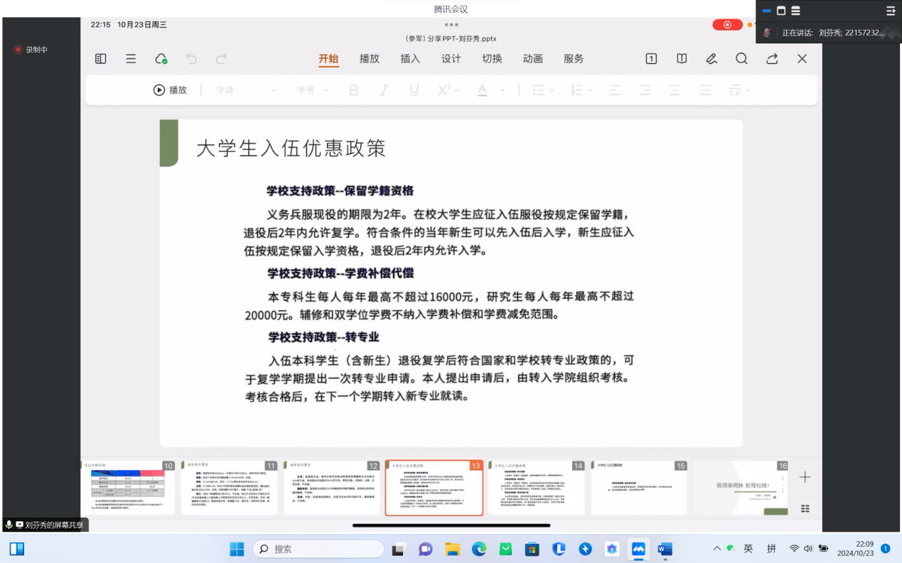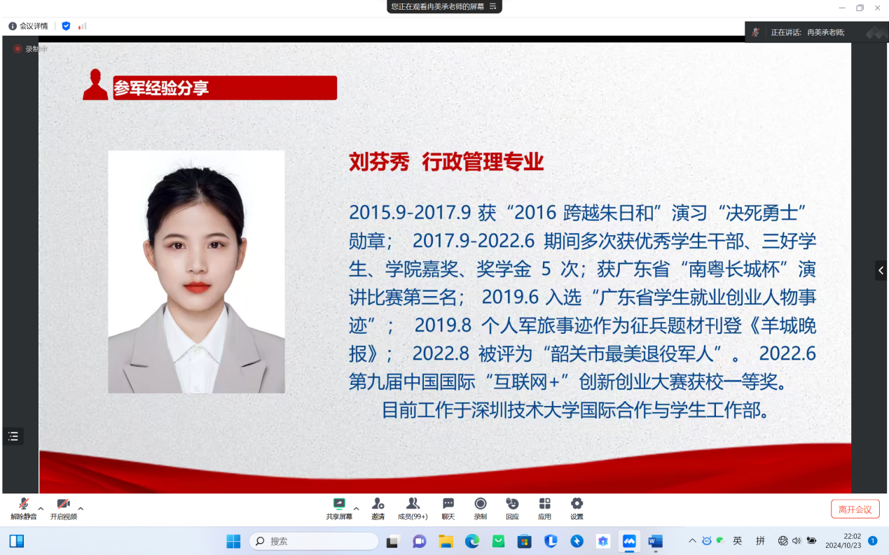 刘芬秀讲述了自己的从军经历、学习过程及职业发展的个人经验;讲解了参军入伍必知的一些注意事项,如报名时间、应征年龄标准和身体条件要求等;介绍了老员工入伍退役后能够享受到的一些教育优惠政策,如保留学籍资格、学费补偿代偿、考研加分、考研专项计划以及创业优先扶持等;她强调,入伍的关键在于决心和身体素质,参军并不像考研考公一样需要长时间的持续准备,更多在于决心和过硬的身体素质,且要深刻领悟参军对于国家国防、人民安居乐业的重大意义!