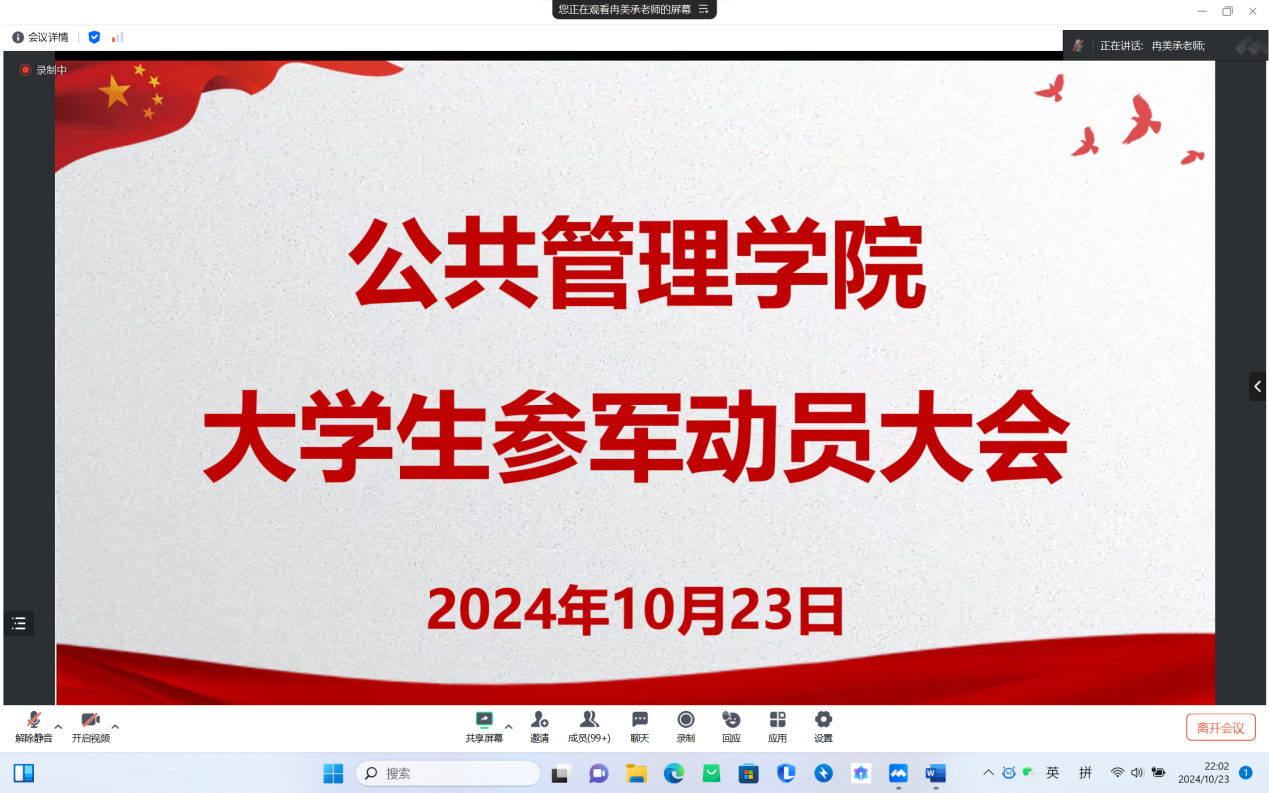 为激发公管学子爱国情怀、普及征兵政策、培养员工国防意识,鼓励员工积极投身军营,2024年 10月23日晚,云顶国际vip.888老员工参军动员大会在线上腾讯会议顺利召开。会议邀请了18级行政管理专业退役老员工刘芬秀作经验分享,云顶国际vip.888党委副书记吴喜涛、全体辅导员老师出席此次会议,公管21级及22级近400名学子参加此次会议,会议由冉美承老师主持。