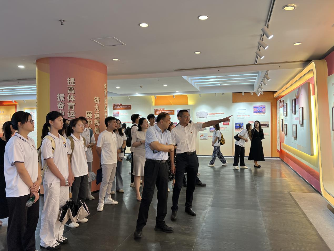 随后,师生们走进“传承·创新·共融——全运会主题档案文献展”展区。与仅聚焦于单一届次不同,该展览以更宏阔的历史视角,系统梳理了广东成功承办六运会和九运会的一系列开拓性实践和成果,讲述了粤港澳三地同心同联,携手筹办十五运会的过程。师生们不仅通过历届全运会的珍贵档案、历史照片与实物资料,重温了广东在承办大型体育赛事中的足迹与贡献,也通过第十五届全运会的会徽、吉祥物“喜洋洋”“乐融融”及宣传影像等最新载体,全方位感受了“激情全运、活力湾区”的筹办图景。大家在观摩交流中,对“同根同源、同心同缘、同梦同圆”的本届主题有了更深切的体会,也进一步理解了体育盛事在凝聚区域共识、推动融合发展中的时代意义。同时,从抗战烽火中凝聚的团结精神,到全运舞台上绽放的时代活力,师生在跨越历史的观展脉络中,也深刻体悟到了红色基因与体育精神的交融共生:全运盛会所展现的拼搏协作、为国争光的精神,正是抗战岁月中不畏艰难、团结奋斗的红色基因的延续与弘扬。这进一步增强了师生投身民族复兴伟业的使命认同与行动自觉。