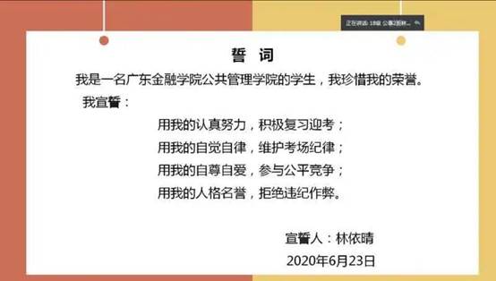 紧接着,员工代表林依晴发言。她对于即将到来的期末考试,在会议上向我们分享了两个关键词:一是适应。在疫情之下的网络学习模式,我们要学会去主动适应,不单单是从心理上去适应当前的网络学习模式,还要适应网络学习中的自我复习,并不断尝试去总结。二是效率。在适应下学习,要合理安排好时间,定好目标与计划,高效高质地完成每一件事。最后她还强调诚信考试的重要性,与同学们共勉,做到“四提倡,四反对”,积极备考,诚信考出真实水平。