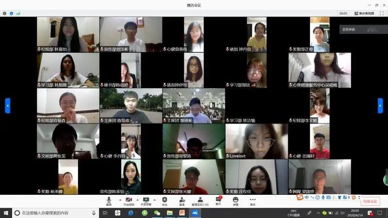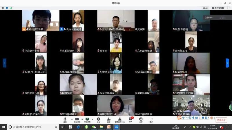 6月14日晚,云顶国际vip.888员工会在腾讯会议上召开了2019-2020学年第二学期第一次全体例会暨竞聘大会,由于疫情的原因,大家都不能按时返校,但这没有阻碍此次会议的顺利召开,大家都克服了各种的困难,积极地参与了本次的会议。云顶国际vip.888党总支副书记吴喜涛、员工会指导老师张新来及员工会全体成员出席了本次会议。