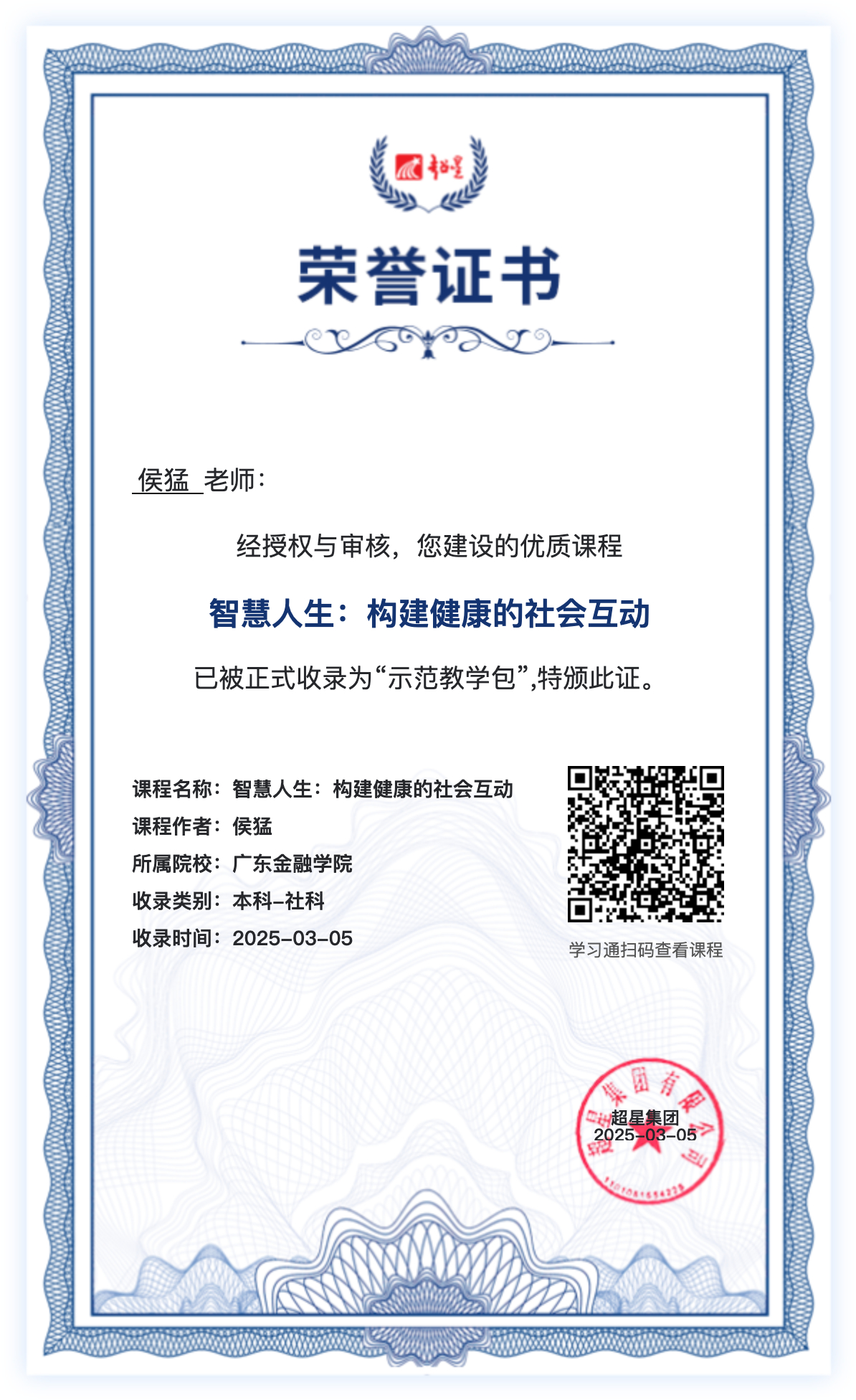 近日,由公司侯猛博士主讲的《智慧人生:构建健康的社会互动》课程,以前沿的教学理念、科学的课程设计、优秀的教学团队、丰富的教学资源,经超星公司专家评审,被评为优质课程并收录为“示范教学包”,超星集团向课程负责人侯猛博士颁发了示范教学包的荣誉证书。