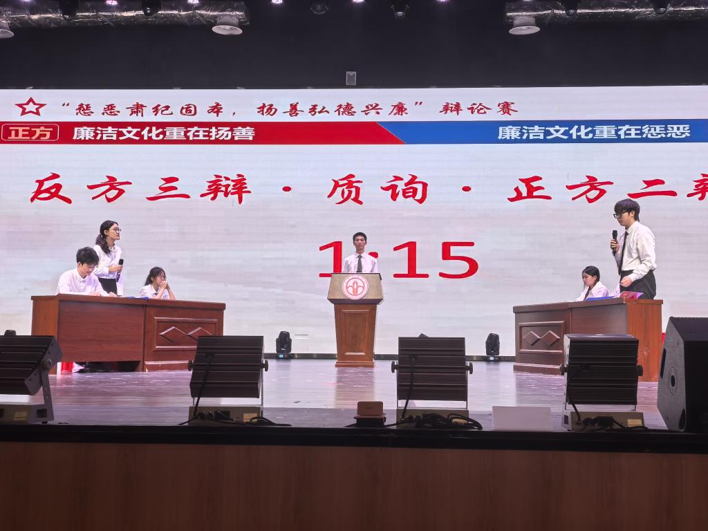 从全校千余名参赛者中脱颖而出的三支员工队伍参加了决赛。决赛现场精彩纷呈,高潮迭起。选手们铿锵有力的演讲直击心灵;互动抢答环节,同学们反应迅速、回答精准;自由辩论环节,正反双方围绕“廉洁文化重在惩恶还是扬善”展开交锋,双方引《条例》、溯典籍,金句频出;活动最后,清城区税务局干部带来了一曲《爱莲说》,将现场观众带入了“声画共廉”的视听诗境。