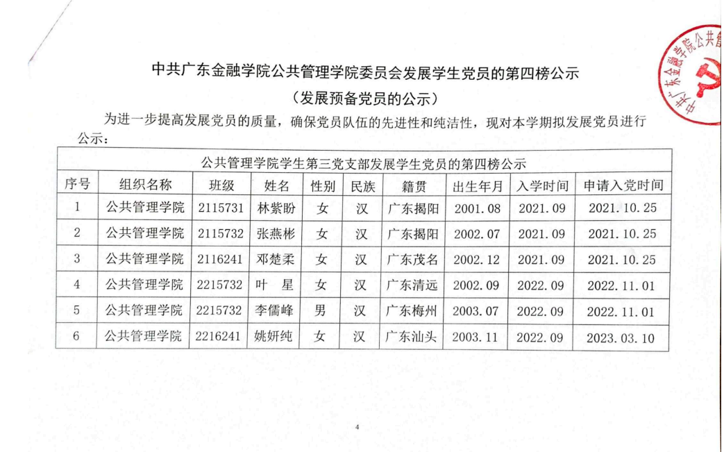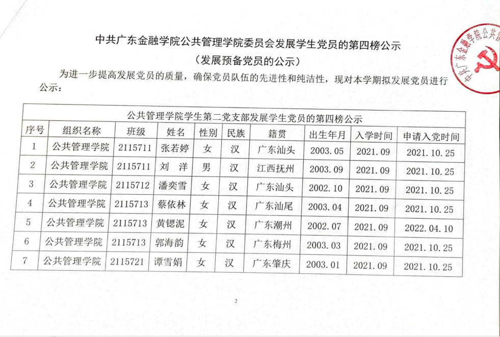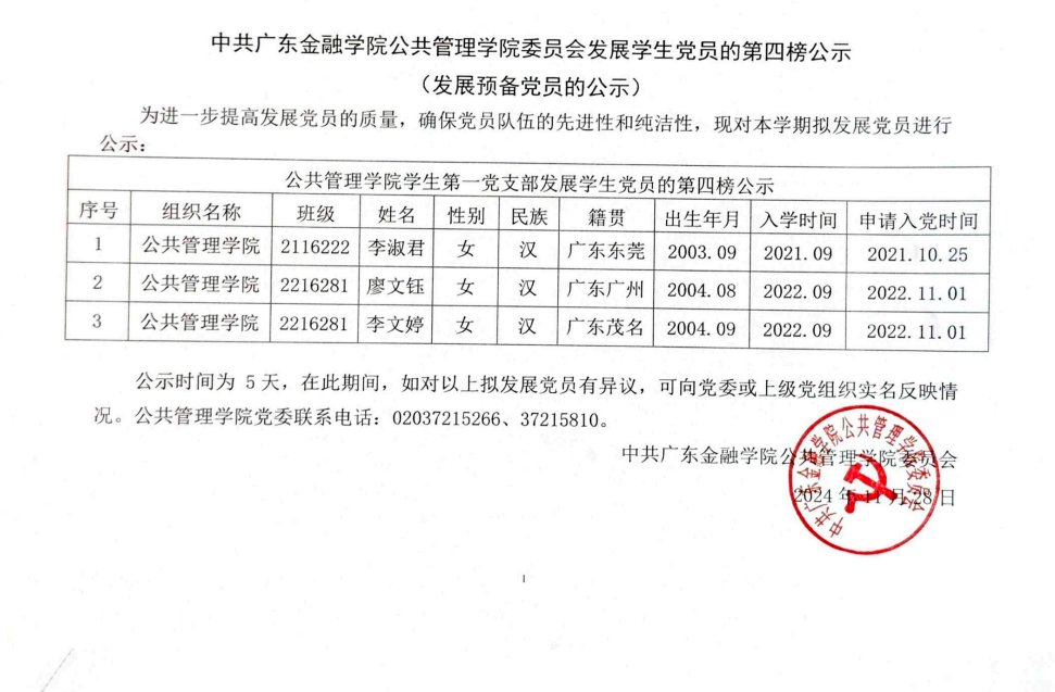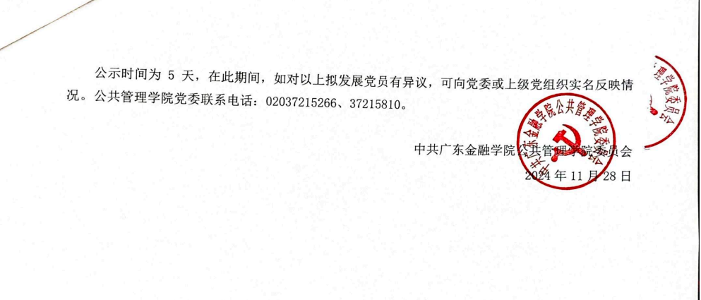 经党委培养教育和考察,以上同志基本具备党员条件,在听取党小组、入党联系人、党员和班级群众的意见的基础上,经研究同意吸收以上同志为中共预备党员。公示时间为2024年11月28日至12月2 日。