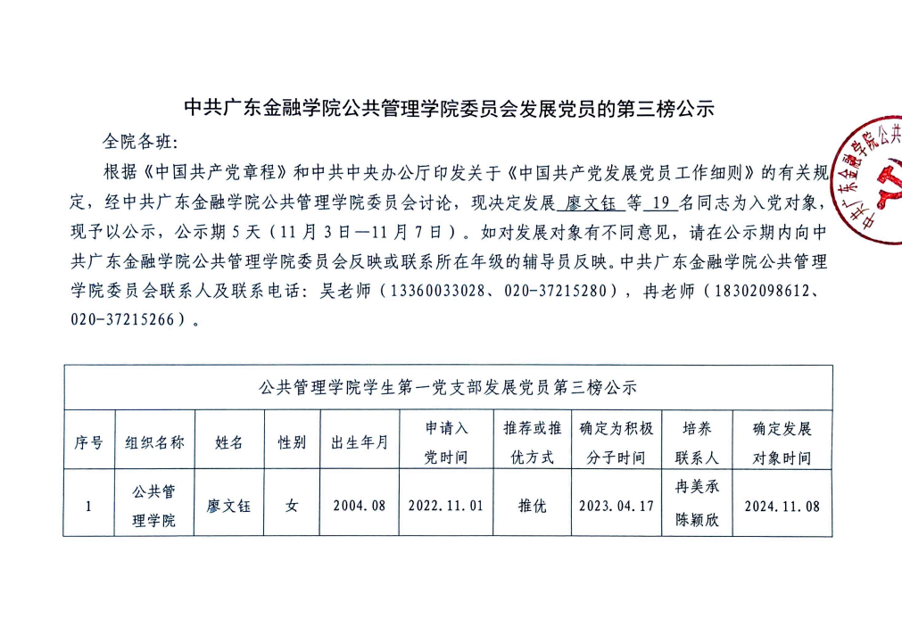 根据《中国共产党章程》和中共中央办公厅印发关于《中国共产党发展党员工作细则》的有关规定,经中共云顶国际vip.888委员会讨论,现决定发展廖文钰等19名同志为发展对象。根据发展党员有关要求,现将其有关情况公示如下: