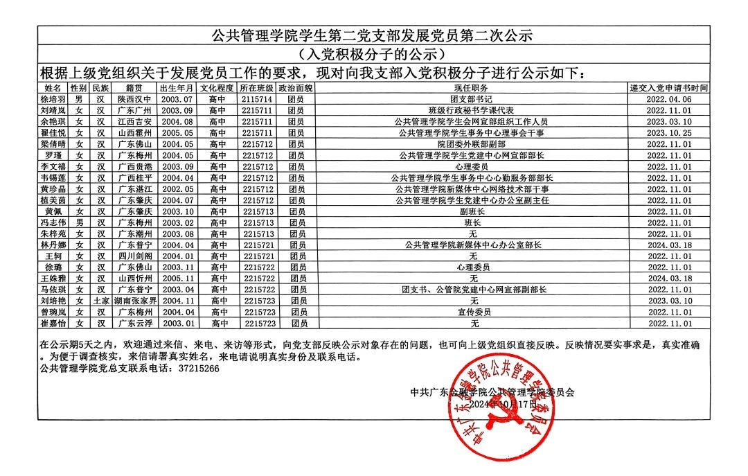 根据《中国共产党章程》和中共中央组织部关于《党员组织发展工作实施细则》的有关规定,经支部委员会审查讨论,拟将黄子桐等33位同志转为入党积极分子。根据上级党组织关于发展党员工作的要求,现对向我支部入党积极分子进行公示如下: