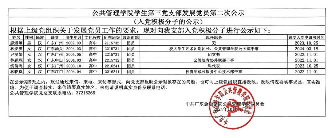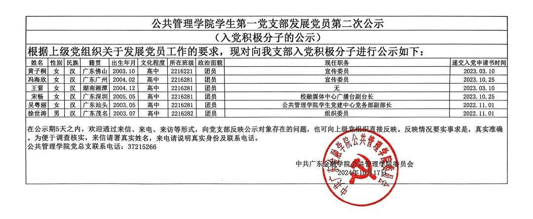 公示时间为2024年10月18日至2024年10月22日。公示期间,欢迎通过来信、来电、来访等形式,向党支部反映公示对象存在的问题,也可向上级党组织直接反映。反映情况要实事求是,真实准确。为便于调查核实,来信请署真实姓名,来电请说明真实身份及联系电话。党支部将对反映人和反映问题严格保密对反映问题进行调查核实,弄清事实真相,并以适当方式向反映人反馈。