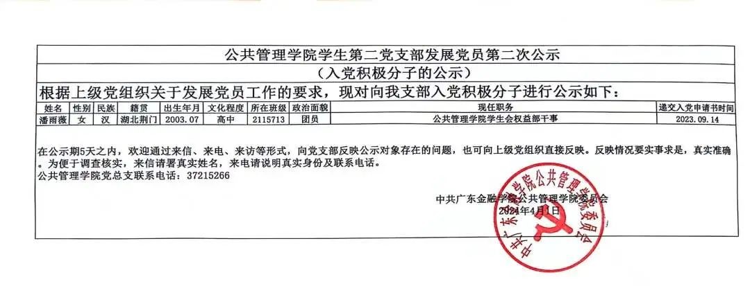根据《中国共产党章程》和中共中央组织部关于《党员组织发展工作实施细则》的有关规定,经支部委员会审查讨论,拟将潘雨薇1位同志转为入党积极分子。根据上级党组织关于发展党员工作的要求,现对向我支部入党积极分子进行公示如下: