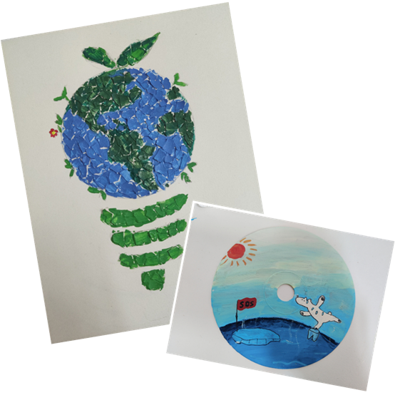 第一幅是鸡蛋壳贴画,整体画的是一个灯泡,上部分圆是地球,大大的地球上仅仅长着稀疏的花草;第二幅的光盘上画的是因全球气温升高和人为因素导致冰川融化而无处安身的北极熊。