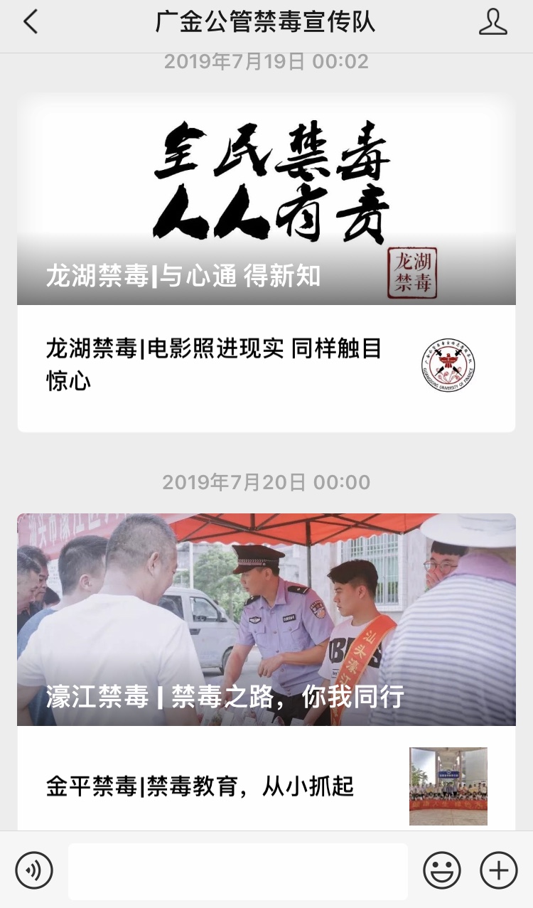 实践队在活动期间不仅在市、区(县)两级禁毒办官方微信公众号上发布活动纪实、毒品知识普及等文章,协助民警运营禁毒办微信公众号,以端庄大气的版面,生动活泼的文字助推线上宣传,还开设社会实践队的微信公众号进行宣传造势,发布活动纪实、感人事迹、个人感想等文章,吸引更多的老员工加入禁毒宣传的行列中来。