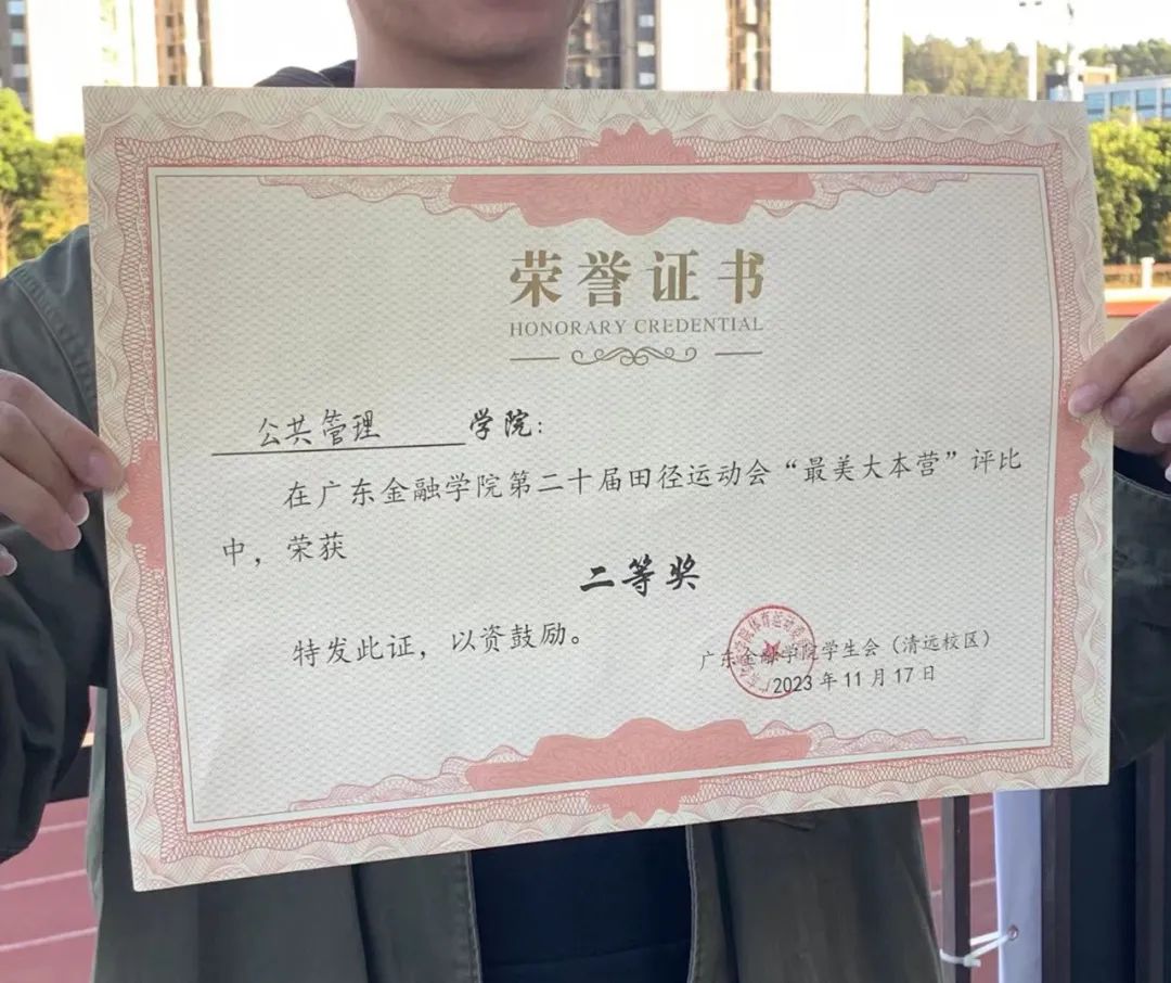 首先,我很感谢我们公管院同学对我们运动员的支持,让我能够顺利的完赛。通过短暂一天的角逐,我在大家的支持下获得了一些名次,上场领奖的心情很激动,也很紧张,它代表着一种荣誉。但我知道这不是我的极限,我将会继续努力,备战下一届的校运会,弥补今年100米留下的遗憾,争取明年为公管院获得更好的名次。