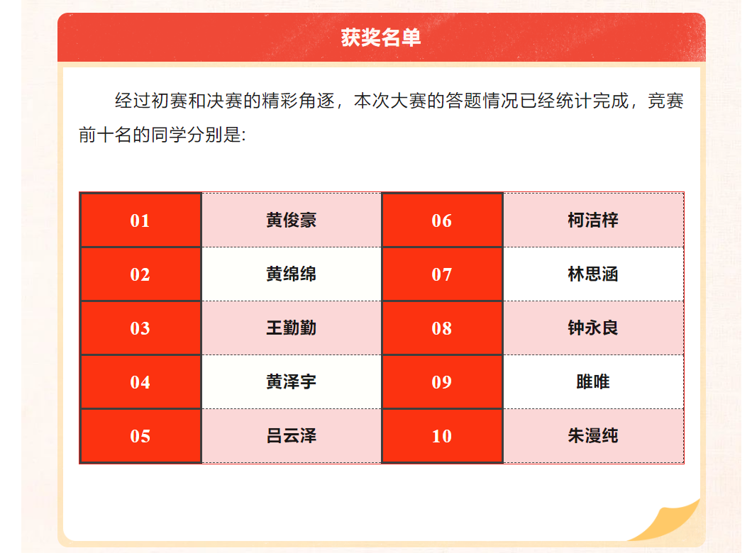 经过初赛和决赛的精彩角逐,本次大赛的答题情况已经统计完成,竞赛前十名的同学分别是: