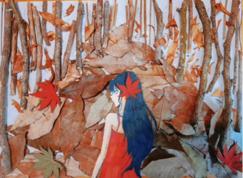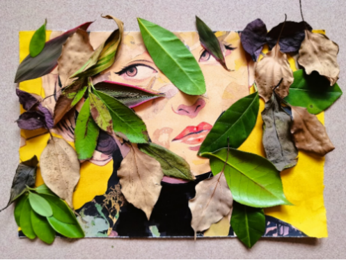 该作品是我与大自然的一次对话,画面下半部分绘制了一幅女性脸部轮廓,皮肤采用了秋日的棕褐色,一抹鲜艳的红唇为整幅画作增添了生动与活力。上半部分则是秋天的主角——树叶。从绿色到棕色,不同颜色和形状的树叶巧妙地拼贴在一起,形成了一片丰富的自然背景。这些树叶与女性融为一体,共同诉说着秋天的故事。