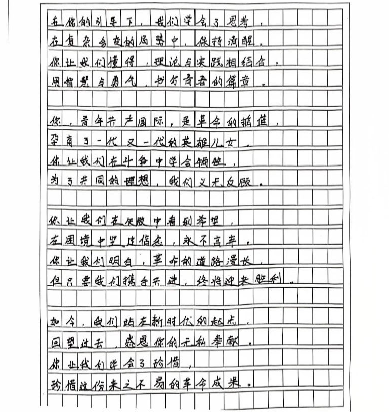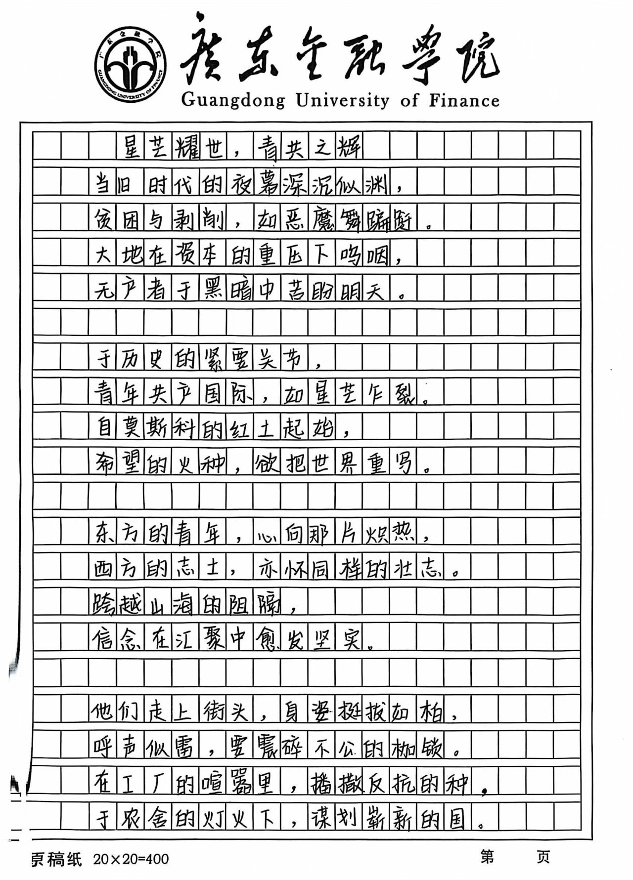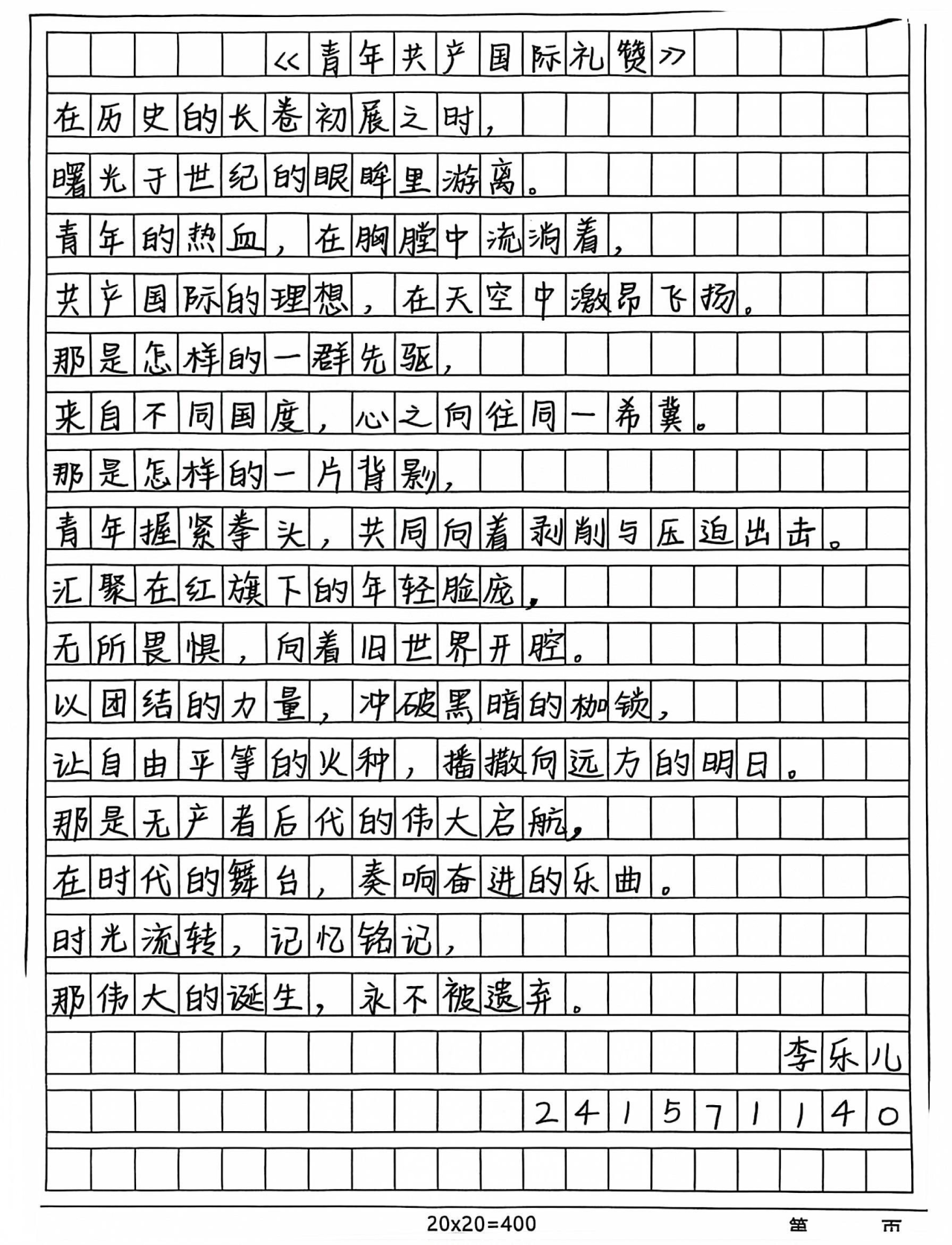 活动期间,同学们以笔为剑,以诗为锋,从不同角度雕琢出对青年共产国际成立的敬仰,青年共产国际的精神之火在更多中国青年心中燃烧,激励着大家在新时代征程上,高举理想旗帜,续写党的辉煌新篇章。每一篇优秀作品都似一颗闪耀的星辰,汇聚成一片浩瀚的苍穹,彰显着新青年的力量与信念。