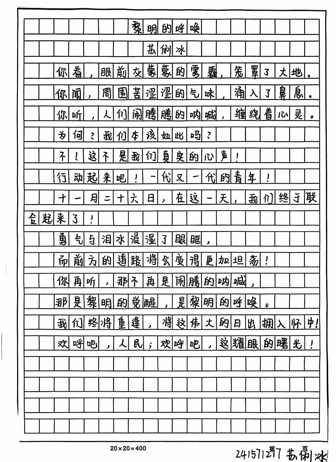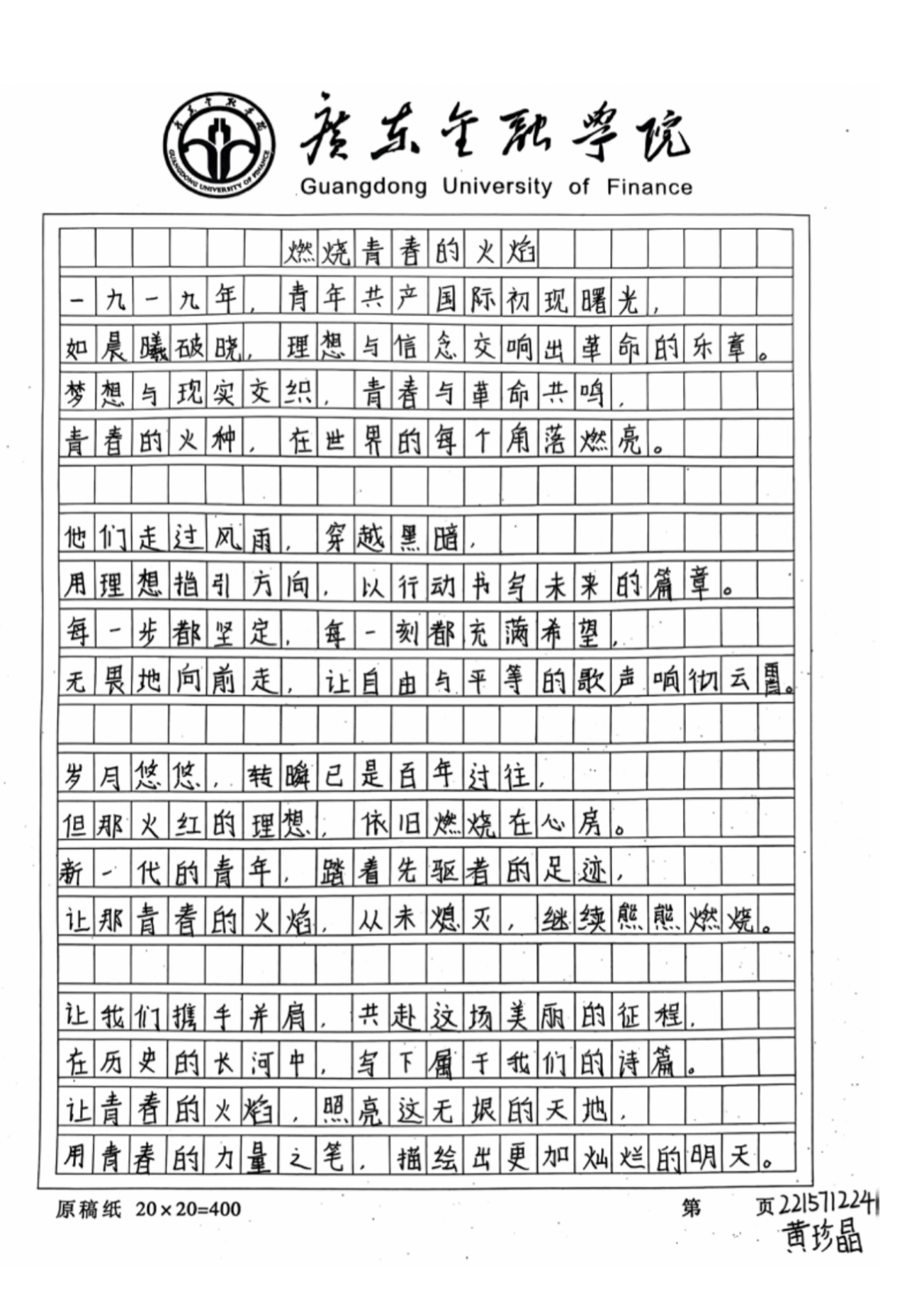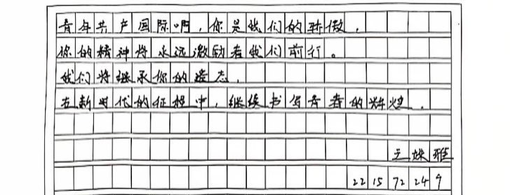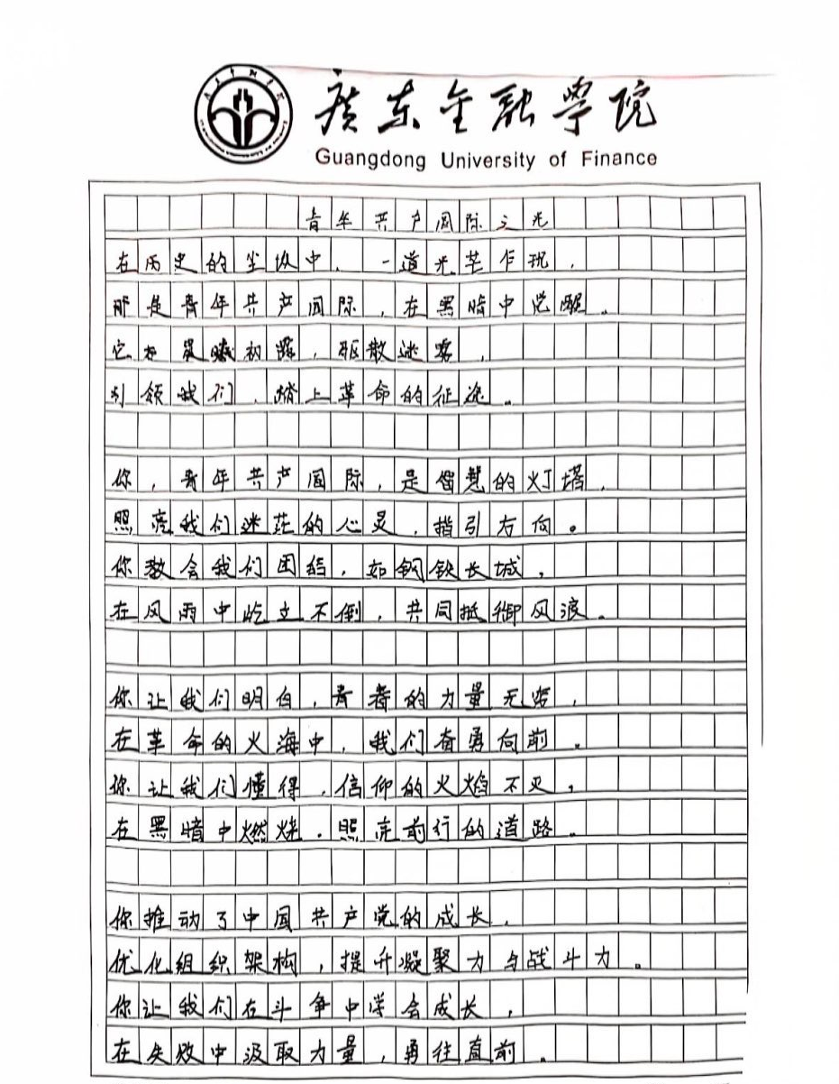 活动期间,同学们以笔为剑,以诗为锋,从不同角度雕琢出对青年共产国际成立的敬仰,青年共产国际的精神之火在更多中国青年心中燃烧,激励着大家在新时代征程上,高举理想旗帜,续写党的辉煌新篇章。每一篇优秀作品都似一颗闪耀的星辰,汇聚成一片浩瀚的苍穹,彰显着新青年的力量与信念。