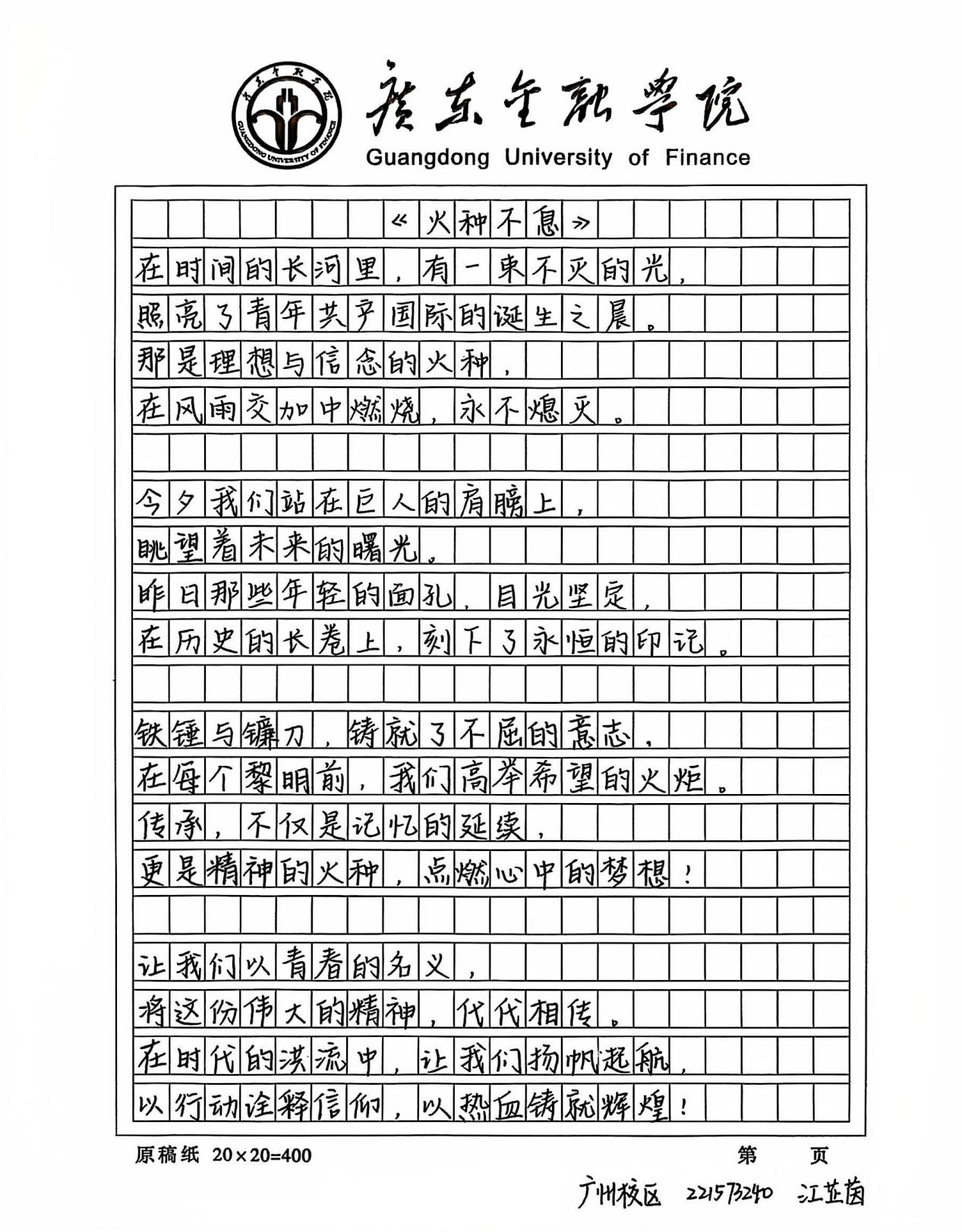念往昔,处今夕,在时光的长河中溯源,青年共产国际成立对中国共产党不懈奋斗的激励依旧鼓舞人心。在一篇篇优美的诗篇里,可以看到青年们传承精神、砥砺前行的鲜活群像,回溯往昔热血岁月,重现先辈们的壮志豪情。愿同学们在今后的学习、生活、工作中继续汲取青年共产国际的精神,弘扬强国之志,在时代浪潮中继续书写老员工的强国华章。