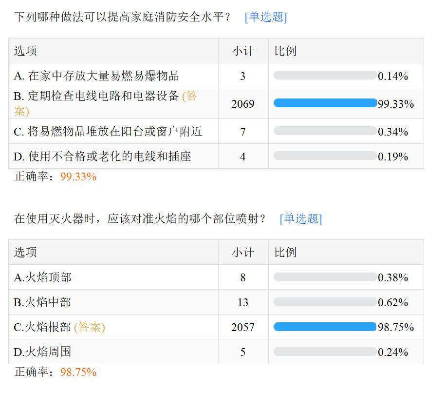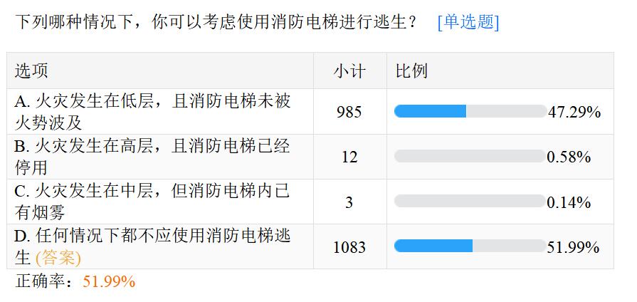 题目作答正确率较高,可见同学们的消防安全意识较强,留心注意生活中的大小细节,有正确的防范火灾观念和自我保护意识。当然,试题中不乏极易混淆的错误选项,例如对消防电梯的合理使用,不少同学在此误答。