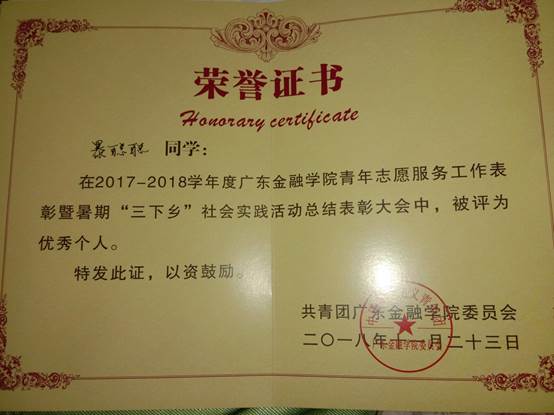2018.11获2017-2018学年度三下乡社会实践活动“优秀个人”奖
