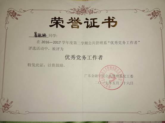 2017.5获2016-2017学年度“优秀党务工作者”称号