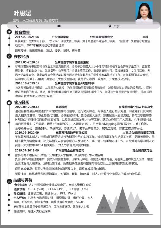 最后需要将自己过往经历用量化的方式体现在简历上,比如实习招聘过程中面试、面试通过、offer发放、成功入职等数量以及招聘转化率等,这样会更实际地突出个人在过往实习中的成绩。