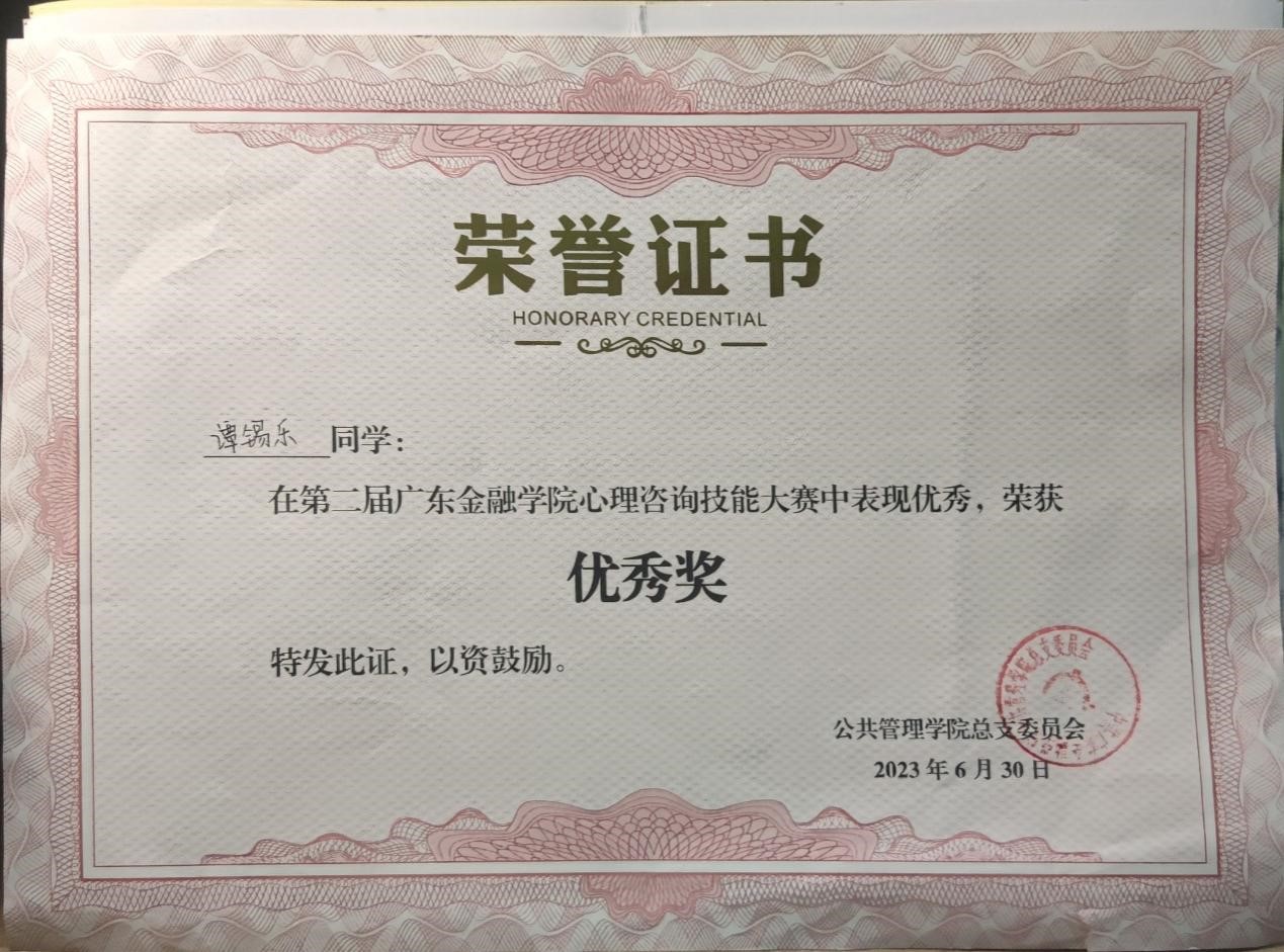 2023.06在第二届云顶国际vip8866心理咨询技能大赛中获“优秀奖”