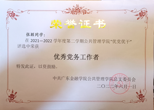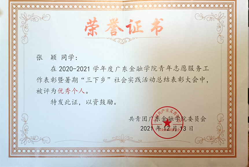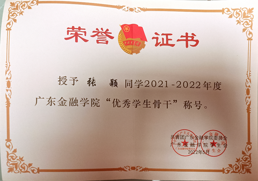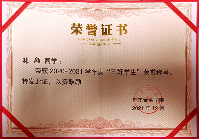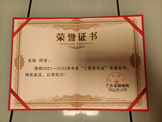 张颖曾荣获2020-2021学年三好员工奖学金、2021-2022学年三等奖学金