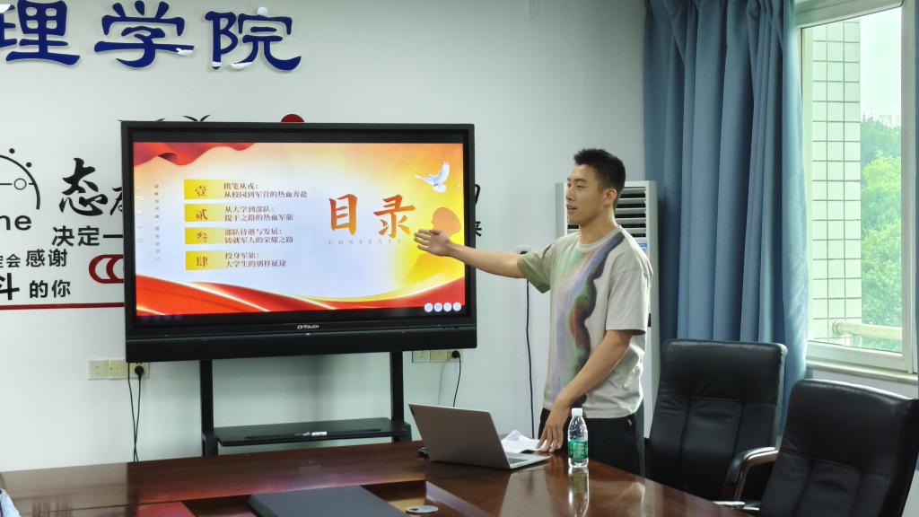 卓子豪以铿锵有力的语言,讲述了自己从校园走进军营的心路历程,生动诠释了将爱国之心转化为爱国之行的成长经历。他从大学实习经历谈起,认为自己在2020年放弃入职优质企业的机会,毅然入伍参军是无悔的圆梦之举。他分享了在军营中锻炼成长、为民服务的难忘经历,向大家展示多类兵种着装、演习训练记录与队内丰富活动的影像图片。他表示,严格艰苦的训练条件和紧迫复杂的执勤任务都是他从一名普通老员工成长为一名合格的军人必经之路。为继续献身国防,卓子豪通过自身努力和考试选拔提干成为一名军官。新的身份代表着更沉重的责任。“愿以吾辈之青春,护卫这盛世之中华!” 卓子豪激励同学们勇敢追逐戎装梦想,参军报国、不负韶华。