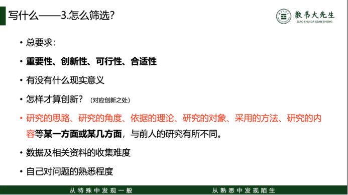 首先,重要的是研究是否有用处即对社会或认知有何帮助;其次,创新性的定义可以从研究对象、研究视角、理论和方法等方面体现;第三,可行性包括能否通过调查问卷、访谈等方式实施研究以及数据分析等手段。最后,合适性则关注研究对象与研究者自身的关联度。总的来说,研究应该具有实际应用价值和创新性,同时也需要考虑到可行性。